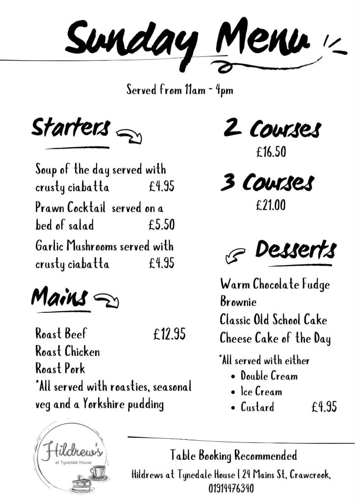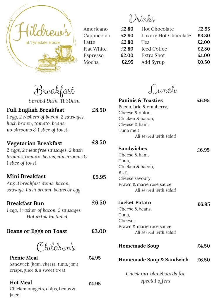 Enjoy our delightful Cuppa n Cake deal at Hildrews for just £5! Choose any hot drink from our extensive menu, paired perfectly with your favorite cake selection. Whether it’s a comforting Americano with a slice of rich chocolate cake or a creamy Latte alongside a decadent cheesecake, this unbeatable offer allows you to create your perfect pairing for a satisfying treat at our cozy spot in Crawcrook, Newcastle.”